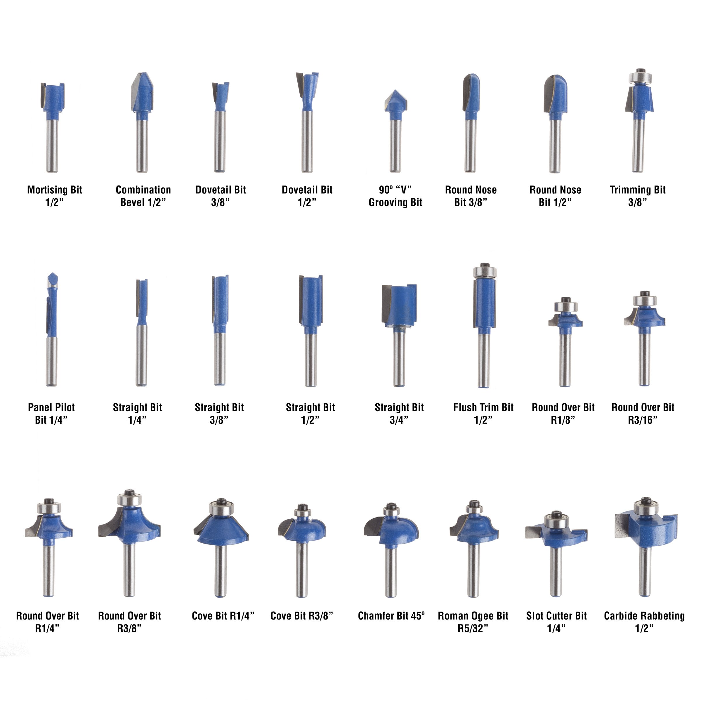 - MULTIFUNCTIONAL ROUTER BITS - This wood working tools set also includes router bits for more intricate projects, including 90-degree V-groove, round nose, trimming, 45-degree chamfer, flush trim, Roman Ogee, slot cutter, and rabbeting wood router bits.