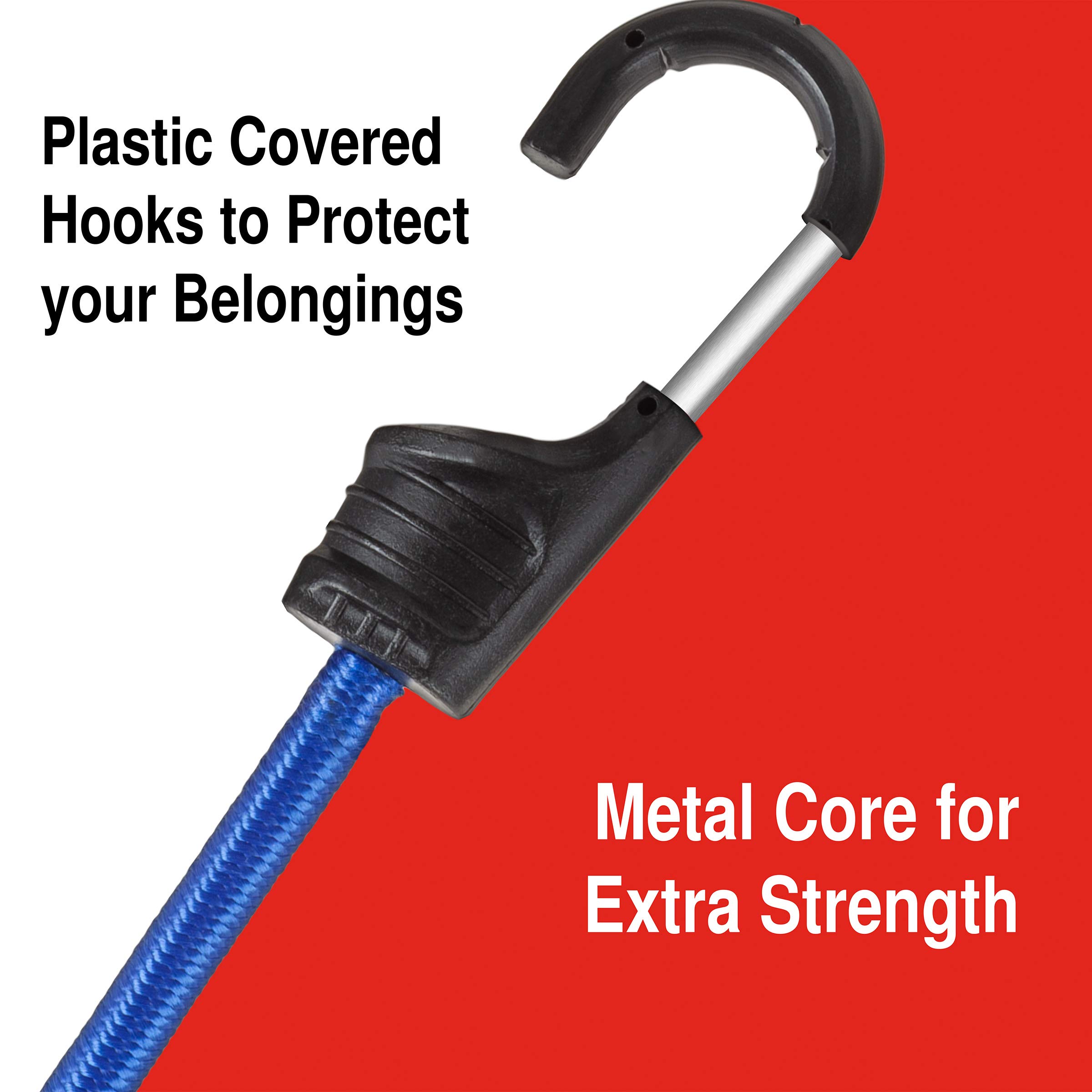 - WEATHER RESISTANT- The UV resistant cord jackets and plastic covered metal hooks on these bungees can hold up to the elements for indoor and outdoor use. These durable straps will secure your important items without breaking or deteriorating.