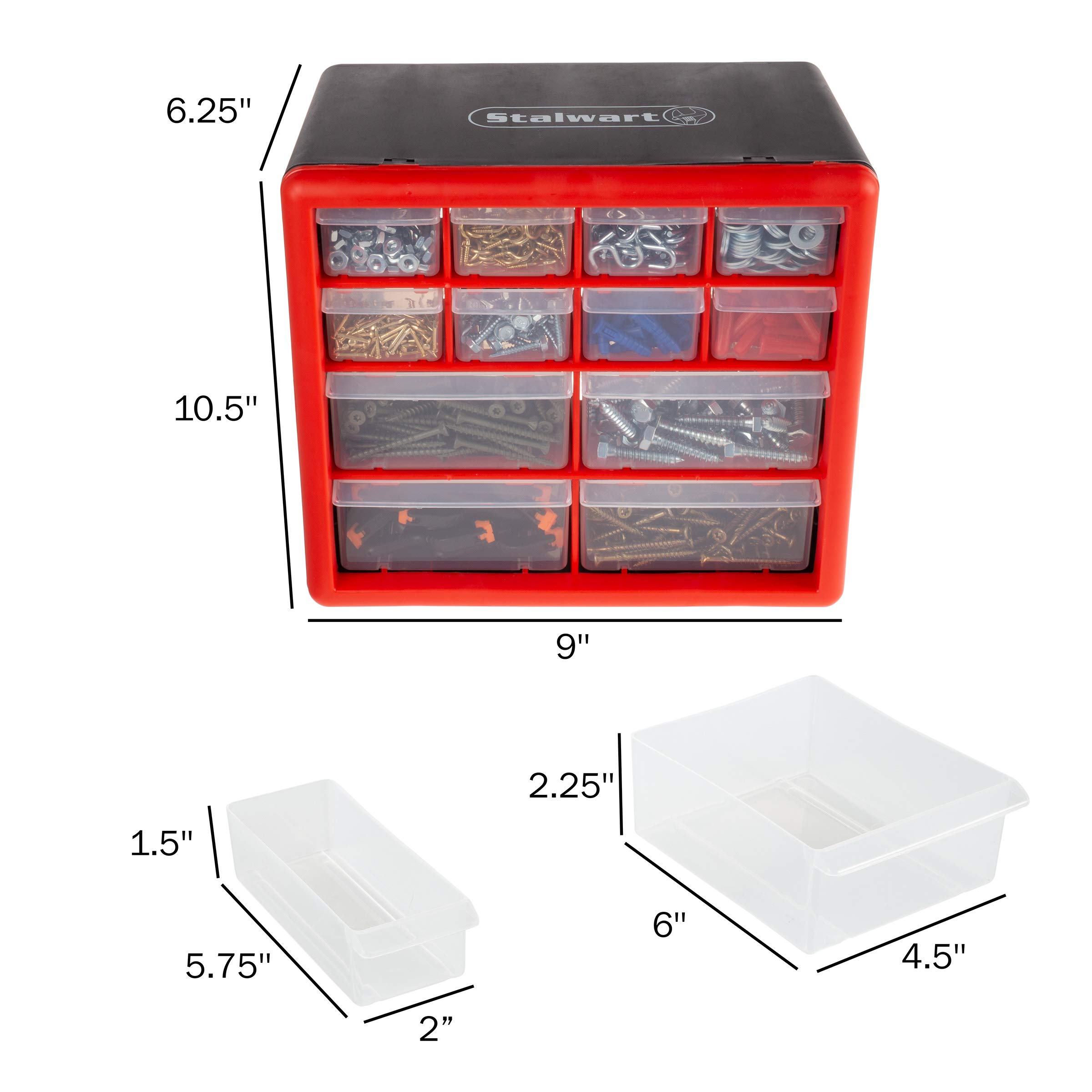 - PRODUCT DETAILS- Material: Polypropylene. Overall Dimensions: (L) 10.5” x (W) 6.25” x (H) 9”; Small Drawer Dimensions (8 Each): (L) 2” x (W) 5.75” x (H) 1.5”; Large Drawer Dimensions (4 Each): (L) 4.5” x (W) 6” x (H) 2.25”. 12 total drawers.